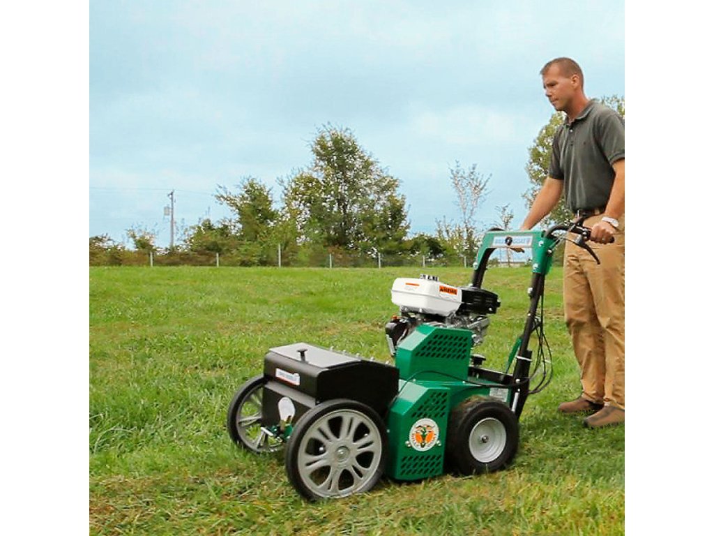 Tento dosévač s motorem Honda GX270 o výkonu 8,4 HP má pracovní záběr 56 cm a exkluzivní nůž s 11 čepelemi, který doslova pluje po terénu trávníku. Zvyšuje se tak kontakt osiva s půdou a klíčení. Nastavení hloubky nože snižuje jeho opotřebení. Na rukojeti stroje se nachází i systém pro nastavení množství osiva.