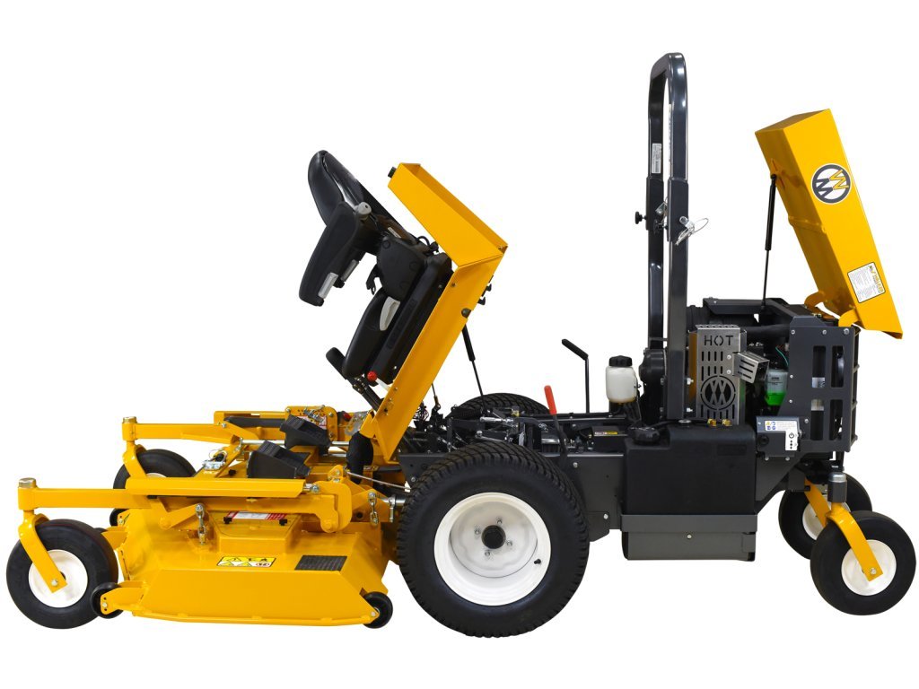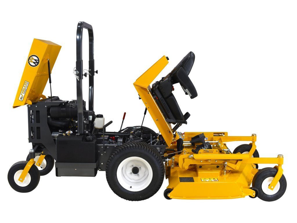 Sklopné tělo stroje - Každý Walker má sklápěcí karoserii, která usnadňuje přístup ke hnacím řemenům, elektrickému systému, motoru a hnacímu ústrojí. Toto usnadňuje servis a údržbu. Nejsou potřeba žádné speciální nástroje ani vybavení. Jednoduše uvolněte západku, kryt s plynovou pružinou se otevře a vy máte volný přístup ke všem pracovním komponentům sekačky Walker.